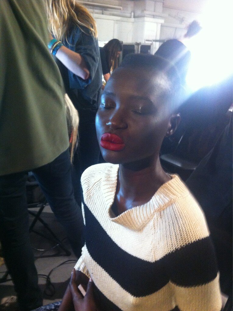 The models wore barely there makeup minus MAC 's Ruby Woo lipstick, very Rihanna-esque. Elle tweeted a picture of the models getting prepped backstage (left) which just added to the anticipation.